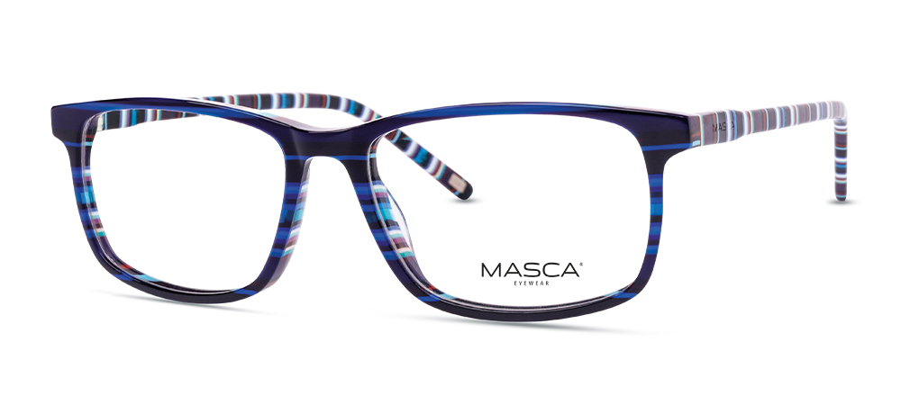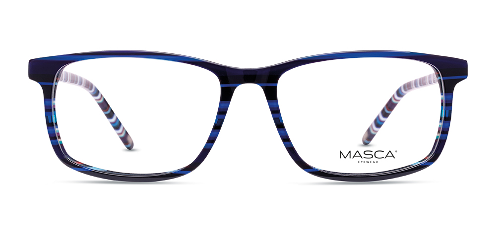 Die MASCA MA4380 überzeugt mit einem markanten Blau-Schwarz-Verlauf im Mittelteil und mehrfarbig gestalteten Bügeln in Blau, Schwarz, Rot und Weiß. Die hochwertige Acetat-Fassung sorgt für angenehmen Tragekomfort und eine stabile, langlebige Verarbeitung.