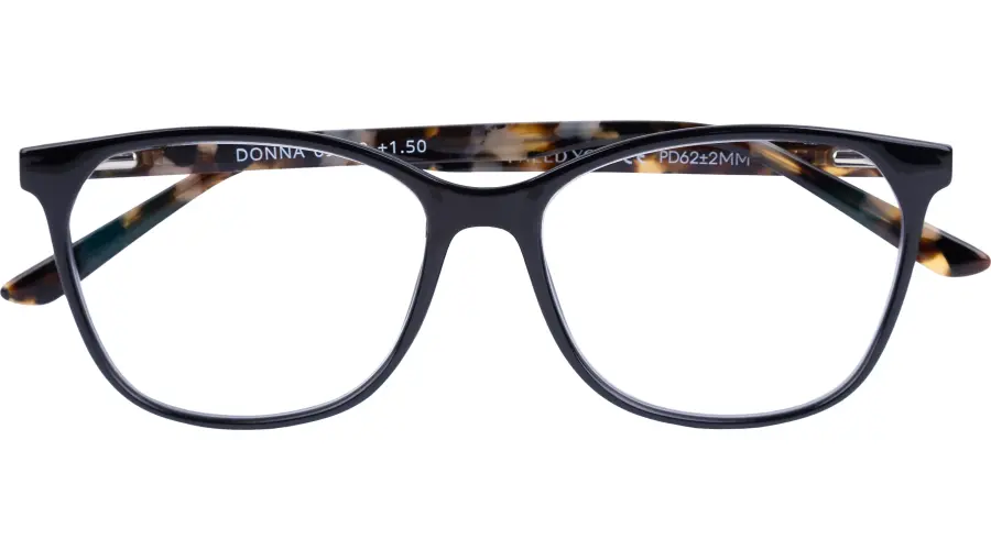 Die DONNA G69600 Lesebrille vereint ein elegantes schwarzes Design mit hoher Flexibilität und wird mit Etui geliefert.