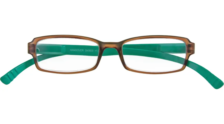 Die HANG OVER Fertiglesehilfe G45600 bietet mit braun-türkisfarbenem Kunststoff, Federtechnik und +1,00 Dioptrien einen modischen Lesekomfort.